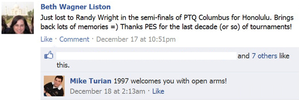 I lost in the semi-finals of PTQ Columbus for Honolulu last weekend to Randy Wright. I posted this somewhat anachronistic event on Facebook and received a response from Mike Turian: