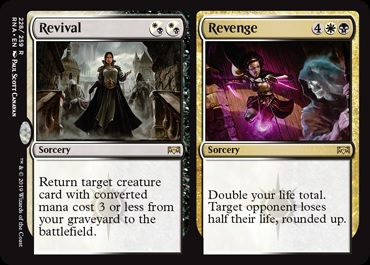 The joy of a good split card is that it is rarely dead in your hand. In the early game, Revival is a great way to get a creature lost to some early combat or forced discard out on the battlefield. A second enter the battlefield trigger to give you a little more advantage. Making it two hybrid mana just means it is that much easier to cast in your deck. You'll be able to use this on turn two most times, and almost any time you have a target in your graveyard worth recurring, you'll have the mana you need to get it.