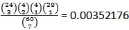 Let’s say we have a sixty-card deck with twenty-four lands and we want to determine how many seven-card hands will have exactly five lands in them. We would plug the following numbers into our hypergeometric pmf: