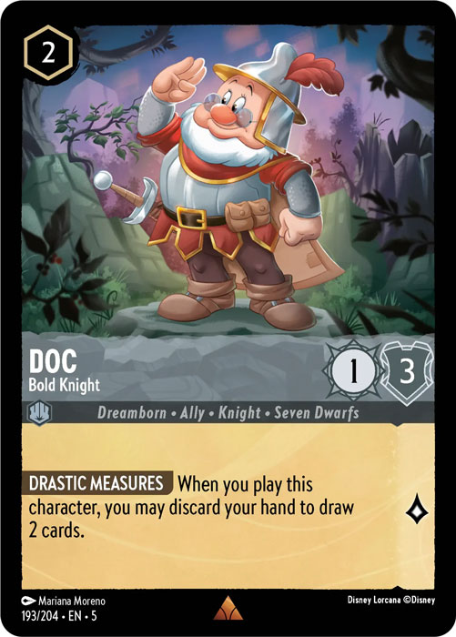 Doc - Bold Knight - This card tickles my brain. Seems like a rare situation that I would use his ability. Without that paying 2 non-inkable for a 1 / 3 isn't good. In this set there is a cool card that would love to see you discard your hand. One of my fellow coolstuffers gets to review it. PS - He's a knight.