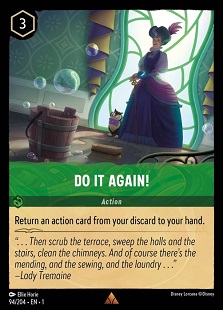 The way the mill happens is a bit mundane but you basically play A Whole New World as soon as possible. Then use Do It Again! and Lady Tremaine - Wicked Stepmother to grab "The Wheel" back to your hand. Replay until your opponents can't draw. Be aware that you draw before your opponents as the Action resolves so you need to make sure you have enough cards on deck to not mill yourself. The easiest way to do this is to carry more than 60 in the deck. I settled in at 65 but I played 64 comfortably as well. In the deck we also run 4 copies of You're Welcome which helps to remove threats as well as putting our opponent one card closer to game over.