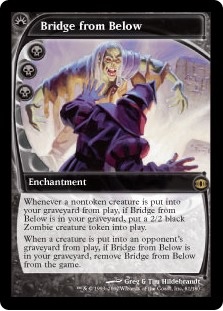 On the other hand, Bridge From Below is a card with text that seems untethered and strange as you proceed through it, but by the end, you understand not just the cohesion of its functionality but also how refreshingly different it is than anything else you know. Cards have had lots of reasons to be fine with being in the graveyard over the years, but here was a card that only worked if it was there. How was this card even developed? How did they decide how to cost it? Why did [ma-na]{B}{B}{B}[/mana] end up with the spot? How many amazing corner cases have we missed on this odd duck because it's eternally tethered to godawful Magic mechanics in Eternal formats?