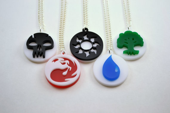 MTG friendship necklaces—brilliant! Offered by LicketyCut in sets of five (one each of each mana symbol), they’re less permanent than MTG tattoos, but still appropriate for the crew. Pro tip: Easily switch out the chain to customize the look—a cord, woven or beaded necklace would work with these charms.
