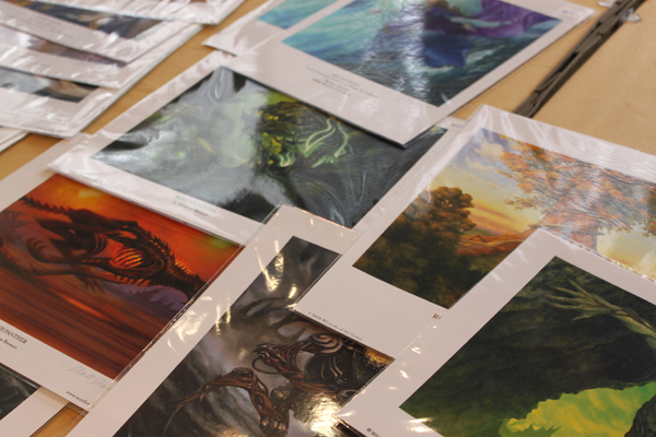 Matt’s not just a fantastic artist but a super nice guy. He signs cards with a little thought behind the signature color, his most prominent trademark a matching green and red John Hancock laid on Rootbound Crag. He was set up sharing his time and craft Friday evening while the grinders were firing. He collected playmats, proofs, and other objects to be sketched upon so that he could finish them all during the night, after his time in the booth concluded.
