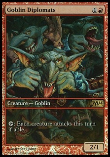 Wizards branded their own takes on a few fantasy races, but none so distinctly as goblins. The dudes have more character here than perhaps in any other fantasy intellectual property. This card reads like a joke: set-up in the name, punch line in the ability. The idea that this would be how goblins treat with others grows funnier as you take it more seriously (facetious naming earns a chuckle, but firmly establishing this tactic in the lore makes me want to start a goblin summer camp). I find this humor to be much stronger on the Game Day promo (pictured), but the normal version does rock a Monty Python influence (my father smelt of elderberries).