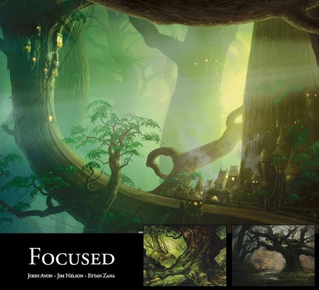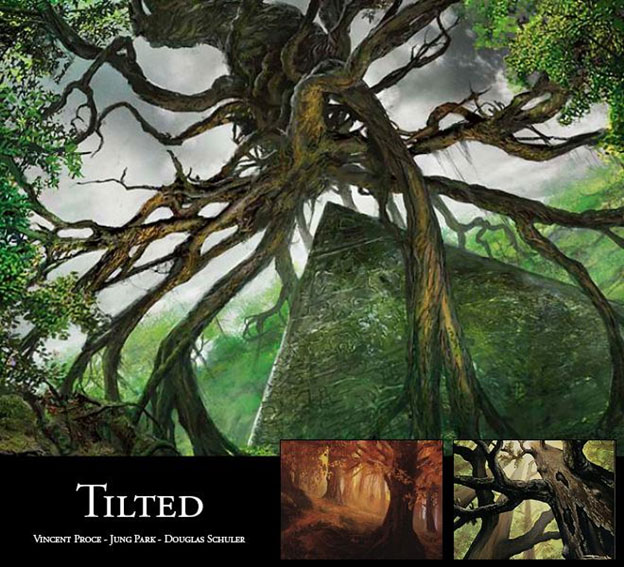 In a suitably brilliant move, many of the MTG artists choose to solve a number of problems with a single, overgrown solution. By placing an ancient tree in the foreground, the painting is immediately simplified, eliminating the painful level of detail work that would otherwise consume hours spent on the background. Forests can be very noisy visually, and the subtle detail of the bark keeps the illustration quiet and serene. The species of the tree, real or imagined, also sets the tone for the piece, giving it a physical and emotional context. The eye is very forgiving to the random nature of a tree’s growth. Compositions in this genre take advantage of conveniently places branches, leaves, and angles to create framing within the scene.