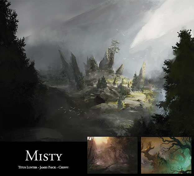 In a setting where a canopy so often obscures the sky, rolling fog banks serve as a workaround to bring clouds into the composition. Mist softens otherwise distracting and unnecessary details, giving tremendous depth to the image. Because we’re in a fantasy setting, it also serves as an easy way to bring new and unexpected color into the composition. Used judiciously, it gives the viewer the information needed to guide him or her along the narrative, but it leaves enough out for the imagination to fill in the details. It’s an incredible achievement, simultaneously offering mass appeal and personal meaning.