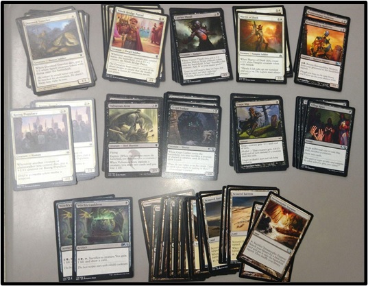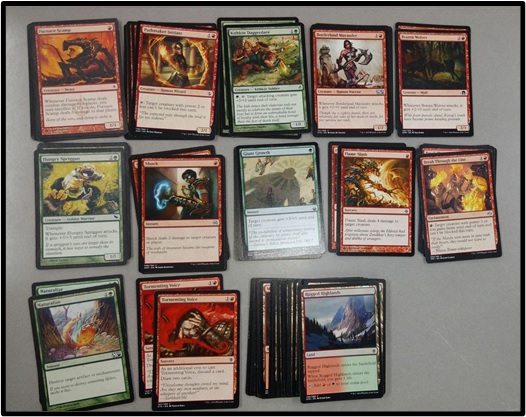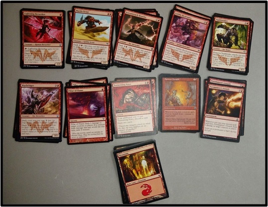 Full disclosure, this is actually one of the first decks created using the donated bulk. Searching through the Red cards, I was able to find a playset of Warbringer. This meant going through everything once more, pulling out every card with the dash ability I could find, and building up from there. Over time, we had a deck! The eventual owner was another student that I have yet to meet: Trevor. Some of the club's regulars tell me that he's played the deck against them, so I know that he's received it. How well he's enjoyed it, though, is something I'll be in the dark on until I actually meet him.