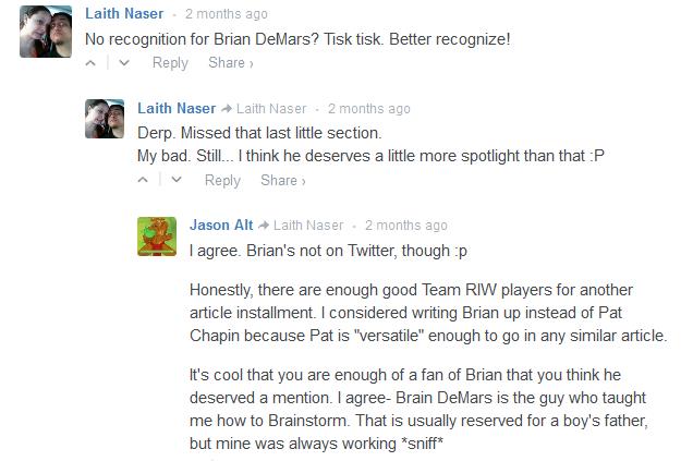 Okay, put the pitchforks down. I’m sure you’ve noticed that I didn’t include a Twitter link for Brian DeMars. There is a very simple explanation for that. Brian doesn’t appear to be on Twitter. This has happened a few times in the past—people I have really wanted to include in a WtF installment have not been on Twitter, and I’ve been forced to exclude them. In fact, I really wanted to include Brian in this installment about RIW Hobbies because Brian gave me a lot of guidance right when I was starting to become good at playing Magic, and he was responsible for a lot of positive experiences I had playing at RIW Hobbies during a few summers in the mid-2000s. I felt that I couldn’t include him in that article, and I saw this in the comment section.