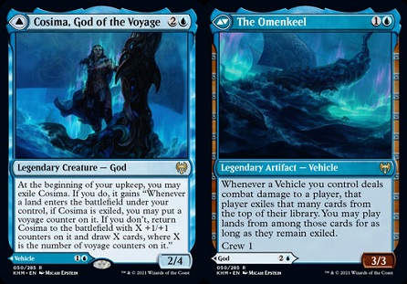 Cosima is kind of decent on the front half and I indeed might end up casting it from time to time, but the real winner here is Cosima's vessel, the Omenkeel. When you hit them with vehicles, which is admittedly a weird thing to have to do, you can exile cards from the top of their deck and play lands from among those cards. Playing their lands is a cool way to mess with their strategy because it could keep them from doing really broken stuff with lands like Nykthos, Shrine to Nyx, Cabal Coffers, or Gaea's Cradle. However, milling them randomly could just as easily draw them right to their good lands as it could past them, which made me have a second thought.