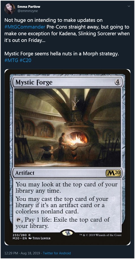What do we think? Needlessly complex? Too close to a stock list? Not close enough? Too many or not enough cards? Let me know in the comments section. As always, it's been a blast coming up with ways to turn their own cards against them and I look forward to maybe teaching you a few things you didn't know (like I had no idea Mystic Forge was quite so spicy and I even like that card). Until next time!