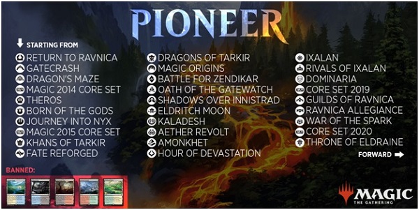 One of my 8 simple rules suggests limiting your card pool so you don't have to limit your deck in any other way and we could limit our card pool quite a bit by only allowing cards legal in Pioneer. However, I don't think that's QUITE what I want to go for since we don't have access to Sol Ring or other Commander-specific cards that we would likely be too non-competitive if we omitted. If you want to really challenge yourself above and beyond what I am doing, though, you could try and build a Commander deck that only contains cards from the following sets -