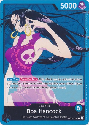 Take OP07-038 Boa Hancock for example. The deck looks and plays a lot like a Seven Warlords of the Sea deck. Most people could just replace Doffy with Boa and call it a day as most of the same cards work in it. Doffy's Seven Warlords version is a wonderful midrange deck. Since there aren't a lot of Blue characters with rush, it's hard to build Blue as aggro.