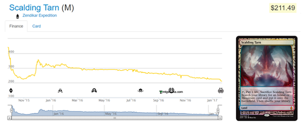 Scalding Tarn had a pretty big dip because people really didn’t know what the frequency of this kind of card would be. It started far too high and fell quickly as we realized there were a lot more. What happened since the rally before Oath of the Gatewatch? Nothing but small loses month over month. We haven’t hit the bottom on the oldest Masterpiece in Standard. The morale of this story is really if you’re not intending to play with a masterpiece then you should sell it immediately. There is no telling how long it will take Scalding Tarn to ever get back to its pre-release pricing.