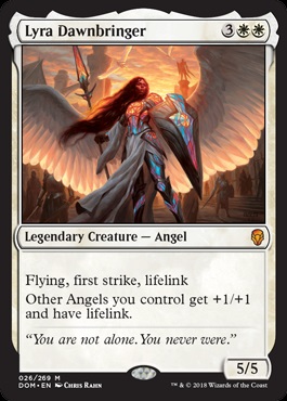So the most obvious analogous to this card is Baneslayer Angel. I know, I get it. I really don't think that giving your other Angels +1/+1 and lifelink is better than protection from Dragons and Demons as odd as it sounds. This card is the quintessential road block for Red aggressive decks. It gains life, it's hard to kill in combat, and it ends the game quickly. There are a few problems right now. This doesn't block any of the best Red cards successfully. It can't block Hazoret profitably, Ahn-crop Crasher embarrasses it completely, and Glorybringer can take it down with help of a burn spell, Fanatical Firebrand, Goblin Chainwhirler, or Soul-Scar Mage. Lyra tries really hard to take up the mantle and price tag left by Baneslayer Angel but I think right now there's no job for her to do. She can get outsided in the ![]()