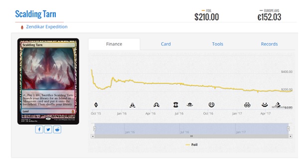 The Zendikar Expeditions were the first and most sought after masterpiece edition. They were also the most overpriced set by a large margin. Stores and players didn’t really know how rare they may be and they were initially priced prohibitively high. How do they look now? Let’s take a look a the flagship from that set, Scalding Tarn.