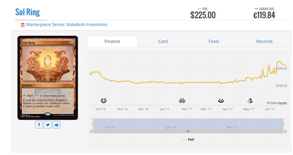 Sol Ring has shown us that it’s possible that Kaladesh Masterpieces are also hitting their bottom and starting to trend up. As is the case with most fall sets, Kaladesh was opened a lot more than Aether Revolt and there should be more supply of those inventions. What is clear though is that some of them are starting to tick up very innocuously.