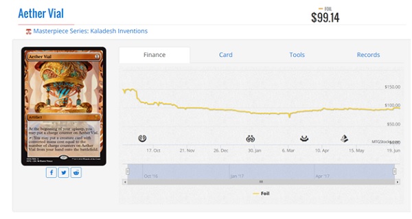 These Masterpieces started at a much more realistic pre-order price and a few of them have already bottomed out and started to trend up. Aether Revolt Masterpieces are the first ones to be disappearing.
