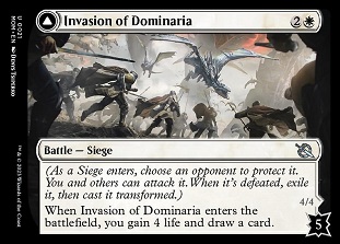 So far, all of the battles previewed have some sort of enters the battlefield effect on the front side, which acts sort of like a sorcery that then creates this altered game state where your opponent now has this position they must defend. For Invasion of Dominaria // Serra Faithkeeper you get a solid but unexciting four life and a card for three mana. So, why must they defend it? Because if you are able remove all of the defense counters on the battle and destroy it, it triggers and allows you to cast it flipped for free, giving you Serra Faithkeeper!