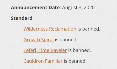 There's no surgical precision here. Standard has been increasingly stale over the last few months and they have decided to just drop the hammer, not only taking out the key card in the universally accepted best deck in Wilderness Reclamation, but also hitting key cards in the other top archetypes as well.