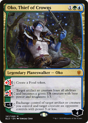 Oko, Thief of Crowns feels mostly like a numbers problem. "Good food enabler" and "give Simic a way to disrupt creatures as well as make creatures" both feel like good, fun design goals. Making food helps make the other food cards good, while making threats and interacting with your opponent's board give Oko a nice level of versatility.