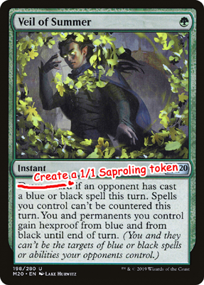 Veil of Summer exists in the awkward world between one and two mana, where at one mana it is utterly broken but at two mana it's barely playable. A reactive card meant to answer your opponent's spells needs to be cheap to be played, but the clean one mana two for one is just too good. As such, rather than try to up the cost I've kept it at one mana but changed the benefit from a card to a small creature. By making it produce something that could be construed as threatening rather than just another card, it makes it better in decks trying to protect their actual threats rather than counterspells decks just looking for a one mana Cryptic Command.