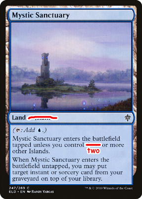 While changing Mystic Sanctuary would end up changing the whole cycle, it's not like anyone is going to be crying that their Gingerbread Cabins aren't as good anymore. By limiting the need to work to only two lands of a type it may actually be an improvement that isn't annoying in older formats with fetchlands.