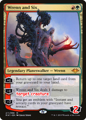 By knocking the starting loyalty down to two there is now more of a risk of running out Wrenn and Six on turn two as he can die to Lightning Bolt and attacks easier, and can now no longer kill two one-toughness creatures and live to tell the tale. We've also weakened his minus one ability a little bit because of how good it is.