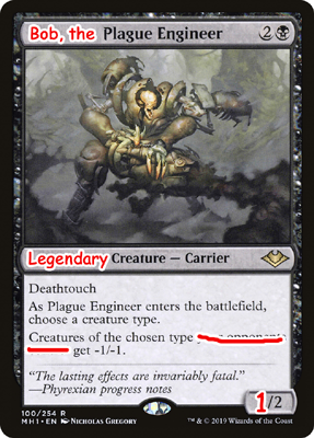 Plague Engineer is far too good on rate to be reasonable, as no card this good against certain decks should be a maindeckable card in your average metagame. We've toned the card down a notch by making the effect symmetrical and making it so you can't have two in play to completely lock your opponent out. However, if the goal of this card was just to provide a good answer to True-Name Nemesis, Mother of Runes, and other annoying small creatures, you could also template it to say "As Plague Engineer enters the battlefield, choose a card name. Cards with that name get -1/-1" to fulfill that purpose. And most importantly leave my damn goblins alone!