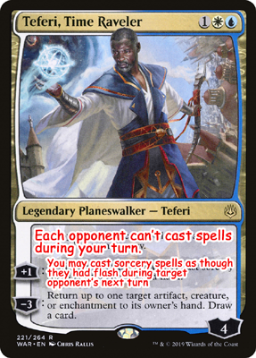 The list could go on basically forever, but nothing feels worse than Teferi doing much more than it was intended to. It seems clear that Teferi was designed to turn off your opponent's ability to interact during your turn and be great against counterspells, but when it does so much more incidentally it feels awful.