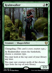 So, Realmwalker. Essentially Realmwalker is just Conspicuous Snoop for whatever tribe you want, which is a very solid effect. The low hanging fruit is elves, where you can cast Realmwalker turn two with Llanowar Elves or Heritage Druid and start tearing through your deck, but the application is there for essentially any tribal deck looking for some card advantage. The body isn't great, but it is more durable than Conspicuous Snoop which is nice.