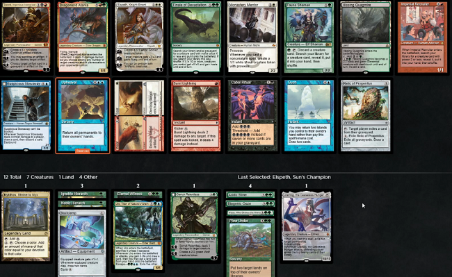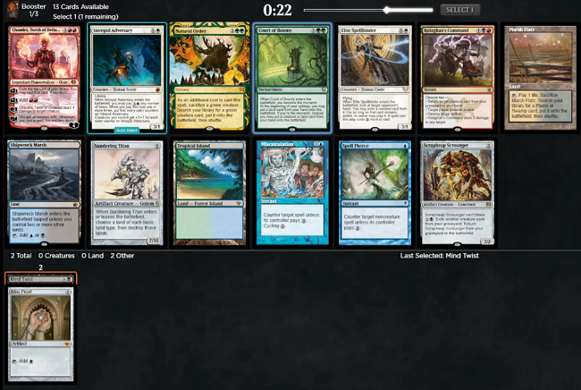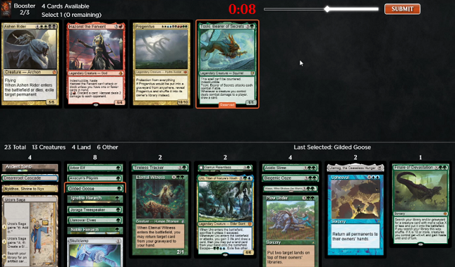 Here we can see the beginnings of a very good looking Mono-Green Ramp deck after pack one, with a Uro, Titan of Nature's Wrath that has already been speculatively selected opening a potential path to Blue/Green.