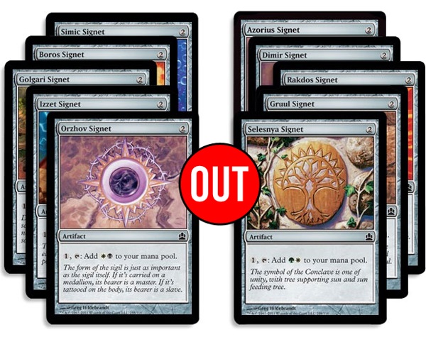 In testing we noticed is that the Signets suffer from the issue described above, they’re great early game, but dead later. The trouble is, there are plenty of good reasons to include Signets in the box. For 2 mana, they’re some of the best ramp options available — they both increase your mana and smooth your colors. Signets are also iconic hallmarks of the Commander format. On the other hand they are the weakest form of artifact ramp in the box, and they are lack luster in the late game. While wrestling with this tension, Taylor offered and interesting solution.