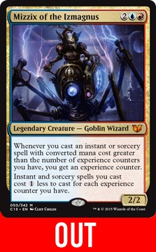 Despite its success, there are a few minor changes that I’ll make to the Commander Pool. The first one is related to the Commander that I chose for the first game. I picked Mizzix of the Izmagnus, because I’m an Izzet kind of guy. The problem with this Commander is that there are not enough low cost Instants and Sorceries to get the experience counters high enough to make a difference. You really need to build around this card to make it work and that makes it poor for the Battle Box.