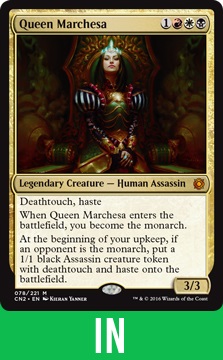Lastly, I added Queen Marchesa to the Commander Pool. She offers a consistent way to introduce the Monarch mechanic into our games, which is something that I want to try out. I have a couple more Monarch cards in mind, but that’s for another day. Queen Marchesa’s ability also support token synergies, which is needed as we try to support a broad range of playstyles. This is the reason that I didn’t remove the other Mardu Commander (Zurgo Helmsmasher), because they both support different playstyles.