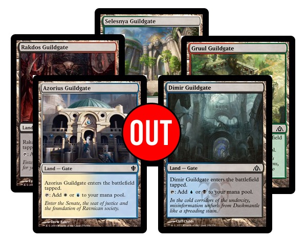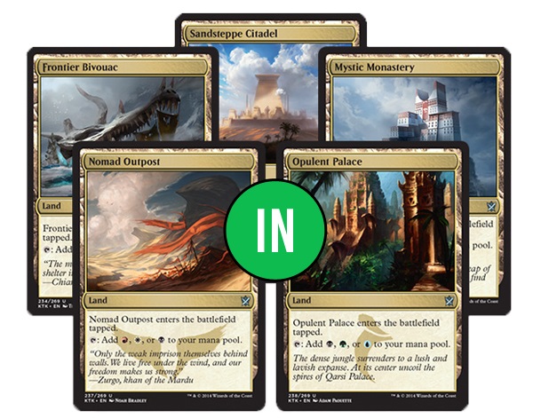 Both my buddies Nick and Jake offered the suggestion to replace the Guildgates with “Shard” lands. This would take some strain off the mana base, and make decisions quicker since your colored mana is more available and it’s easier to see combination. Incidentally, this will also give players the ability to cast more complex color combinations in turns two and three instead of locking them in to certain color combinations based on early land drops. With more colors available players will more easily be able to switch their game plan during the early turns. We’ll talk more about the importance of the early game plays in the next section. I removed the Guildgates for the Khans of Tarkir tri-lands (since those are cheaper than the Shards of Alara tri-lands).