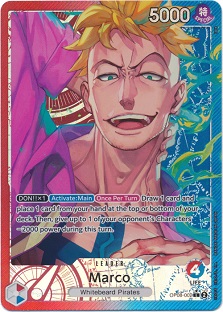 Marco is a dual-color leader with the regular stat line of 5000 power and 4 life. His ability reads: "[DON!! x1] [Activate: Main] [Once Per Turn] Draw 1 card and place 1 card from your hand at the top or bottom of your deck. Then, give up to 1 of your opponent's Characters -2000 power during this turn." Marco is essentially a red-tinted version of Sakazuki. That said, Marco promotes card advantage while also weakening or potentially removing enemy threats. He introduces a new wave of Whitebeard Pirate characters, not only in red but also in BLUE! This is the first time we've seen Whitebeard Pirates in this color, and there are some notable contenders, such as Namule, Portgas D. Ace, and Edward Newgate.