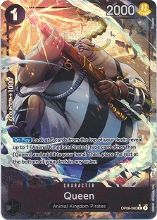 Kaido removes a 7-cost or less character and reduces the opponent's hand size at the cost of one of your cards. Queen searches for Animal Kingdom cards in black. Who's-Who has a +2000 counter and a removal On Play effect.