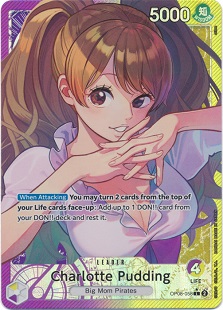 Charlotte Pudding supports the Big Mom Pirates in purple. Her ability reads: "[When Attacking] You may turn two cards from the top of your Life cards face-up: Add up to 1 DON!! card from your DON!! deck and rest it." This ability has the community excited, as it activates on attack without any DON!! cost. By turn two, you could have half of your DON!! already on the field. Key characters for this leader include Charlotte Linlin and Charlotte Pudding.