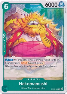 - K.O. up to 1 of your opponent's rested Characters with a cost of 6 or less.". Lastly, Nekomamushi is a larger body character with a conditional rush that can easily be triggered as long as your opponent has seven or more rested CARDS. Not seven or more CHARACTERS rested, not seven or more DON!! rested; seven or more CARDS.
