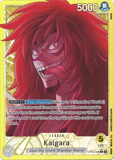 Kalgara, like the other leaders in this set, has 5000 power and 5 life. His ability reads: "[DON!! x1] [When Attacking] Play up to 1 {Shandian Warrior} type Character card from your hand with a cost equal to or less than the number of DON!! cards on your field. If you do, add 1 card from the top of your Life cards to your hand." All right, admittingly this leader does have a striking resemblance to one of our beloved fish-man leader's, Arlong from Set 3 Pillars of Strength.