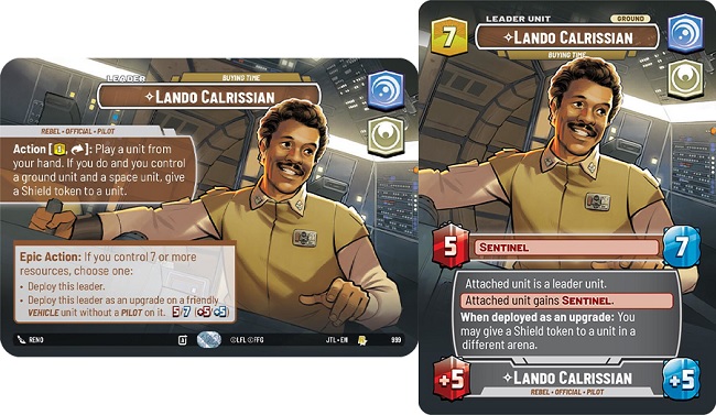 Lando Calrissian is an interesting Leader with a fair amount of requirements to fully benefit from his ability. Lando Calrissian's leader ability is "Exhaust this leader; Pay one resource: Play a unit from your hand (paying its cost). If you do and you control a ground unit and a space unit, give a Shield token to that unit." As an epic action, after you have placed down 7 or more resources, you can flip Lando to his Unit side or as a Vehicle upgrade since Lando is a Pilot leader. Lando's unit side is a 5 power 7 health leader unit with Sentinel, however Lando's vehicle upgrade reads as "Attached unit is a leader unit. Attached unit gains Sentinel. When deployed as an upgrade: You may give a shield token to a unit in a different area."