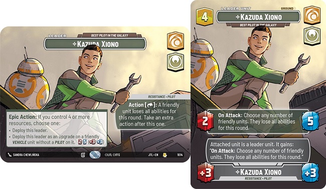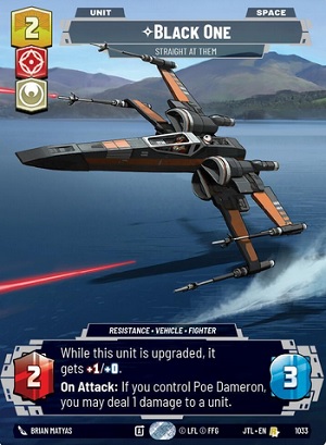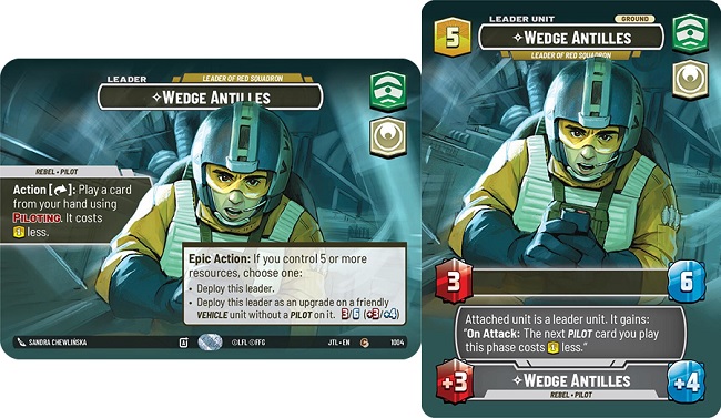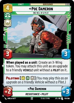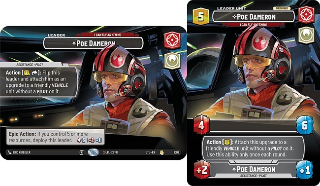 Poe Dameron's pilot upgrade side reads as such "Actions ; Exhaust one resource : Attach this upgrade to a friendly Vehicle unit without a Pilot on it." and provides the upgraded unit with +2 power and +1 health. Some important things to note with this upgrade, and leader ability.... The Leader ability is not an Epic Action, so this function can be utilizing multiple times within a game. The Upgrade also does not turn the upgraded vehicle unit to a Leader-Unit meaning removal pieces that specify "A non-leader unit" can still target the upgraded unit. Even so, once you reach 5 or more resources, you flip Poe Dameron to his Leader-Unit side as an Epic action. Poe Dameron's leader unit is just a vanilla 4 power 6 health ground unit.