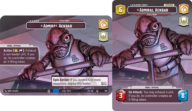 Exhaust a non-leader unit you control. If you do, it's controller creates an X-Wing token". Admiral Ackbar can be deployed to his leader unit as soon as there are 6 or more available resources on your field. Admiral Ackbar leader unit is a 3 power 8 health leader that has the ability " On Attack: You may exhaust a unit. If you do, it's controller creates an X-Wing token" So... seems like Admiral Ackbar wants us going wide. Needing an extra unit on the board just to make the X-Wing token nonetheless.