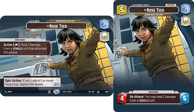 Rose Tico is a leader that encourages you to play with as many Vehicles as possible and hopefully keep them on the board. Rose Tico has a leader ability of "Exhaust this leader: Heal 2 damage from a vehicle unit that attacked this phase." which promotes more aggressive play with your ships on your board. As an Epic action, Rose Tico can deploy as a leader unit once you achieve five or more resources on the field. Rose Tico, leader unit, has 4 power and 6 health and has the ability of "On Attack: You may heal 2 damage from a Vehicle unit."