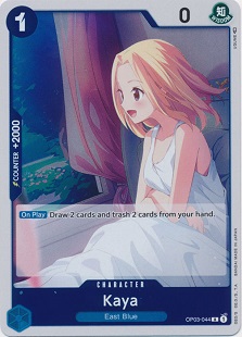 Kaya is a 1 drop, +2000 counter, character with 0 power and an On Play ability that reads "Draw two cards and trash two cards from your hand". Ah yes, Faithless looting has never looked so good in Blue. For self-mill strategies, drawing cards at a cheap cost is critical to the deck, and being able to counter out for +2000 adds versatility to the Kaya character. Although... you'd rather hold onto Kaya when possible, there is more value to be had when you bounce Kaya back to your hand and play her again with bounce effects such as Arabesque Fist.. Or even Zeff!