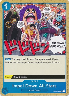 At first glance, this card appears to be a very odd inclusion for any Nami deck. It doesn't even benefit the East Blue leader type, right? Impel Down All Stars reads, "Main: You may trash 2 cards from your hand: If your Leader has the {Impel Down} type, draw up to 2 cards." for a DON!! cost of 1, being able to trash cards from your hand isn't the worst thing for a Nami deck. While not optimal, it does enable you to decrease your hand size so you can draw cards from Events such as Love-Love Mellow or Death Wink. However, the main reason to run Impel Down All Stars is to either gain its triggered ability from life which simply states "Draw two cards" or to pitch this event to Gum-Gum Gavel for its additional cost. Hopefully in the future, this Event will not be necessary for the Nami deck list.. But for now, it's Draw two trigger is too valuable to pass up as a four of in the deck to keep its odds high to be drawn from your life pile.
