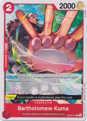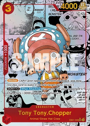 Tony Tony.Chopper is this set's Manga Art which means this blocker will have TWO alternate arts. Manga Art cards are always the crown gem to pull out of any set, but they are harder to get than most alternate arts since there is a chance you might pull it's other Alternate Art printing. However, this little Reindeer is a 3-cost 4000 power blocker with the ability of " DON!!x2 When Attacking: Give up to one of your opponent's characters -3000 power during this turn". Let's emphasize that this card states for the TURN. Chopper is bringing versatility to the table. We all know the card "White Snake" can be devastating enough, providing a character or Leader +1000 for the turn and keeping your opponents from swinging regular old 5000 power bodies at you. Now, imagine Chopper has swung for 6k at your opponent and suddenly your opponent's 7000 power characters can be hit by a 4000 power body on your side, or even a 5000 power character can be removed by characters such as Kuma from Set 5. This Chopper is a great inclusion to almost any red deck, especially ones with Straw Hat support!