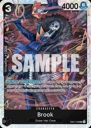 Our next card is another Straw Hat, Brook. Brook is a 3-cost 4000 power character that reads "On Play/ On attack give target character -1 to their cost. Then, K.O. a character with a total cost of zero". This may not look like a lot at first glance, but the fact that Brook can knock out an opponent's character On attack is a huge advantage that has not been present in Black decks prior to Brook. When unchecked, with how much cost reduction is present within Black such as Ice Age, Hina, Soap Sheep, and Leaders such as Set 1 Smoker and even starter deck characters like 4-cost Shirahoshi, Brook can remove a wide range of characters. It does of course come at the cost of One DON!! Attachment just to ensure that you are swinging for 5k at your opponents, but that is a price we are willing to pay for removal.