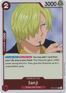 Looking at Sanji, he is a 2-cost 3000 power with a +2000 counter on him and an ability of "Activate:Main Once Per Turn you may add 1 card from your life pile to your hand and this character gains +2000 power and then you may attach two rested DON!! onto this character." Looking plainly at Sanji, he is 3000 power so he won't hit a leader with that power by itself, and he removes a card from your life pile? He must only be used as a 2k counter from hand... right? Nah. Removing a card from life to buff Sanji opens up the door for more cards in your hand, and your life isn't normally relevant when you constantly applying pressure to theirs. The more cards in hand, the better. PLUS, as aggressive as Red decks are, Sanji could get two rested DON!! that had been attached from one of your other characters to Sanji taking him from 3000 power to a hearty 7000 power forcing your opponent into a position where they must use a 2000 counter... unless they are playing a 6000 power leader. Then it's a different story of course.